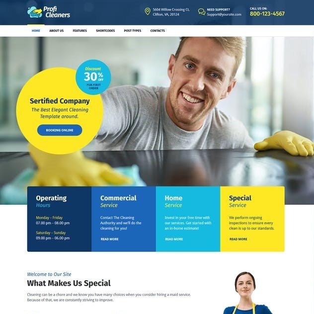 Cleanora teması, temizlik şirketleri web siteleri için hepsi bir arada bir çözümdür. Tema, bir temizlik maliyeti hesaplayıcısı, temizlik şirketinizin ekip üyesini tanıtmak için profil gönderi türü ve sunduğunuz hizmetleri göstermek için bir hizmet gönderi türü ile kolayca bir temizlik hizmetleri işletmesi web sitesi oluşturmak için gereken tüm işlevselliğe sahiptir. Tamamen entegre ve tarz bir WooCommerce mağaza bölümü, temizlik ve çamaşır yıkama ürünleri için çevrimiçi satış yapmanızı sağlar.
